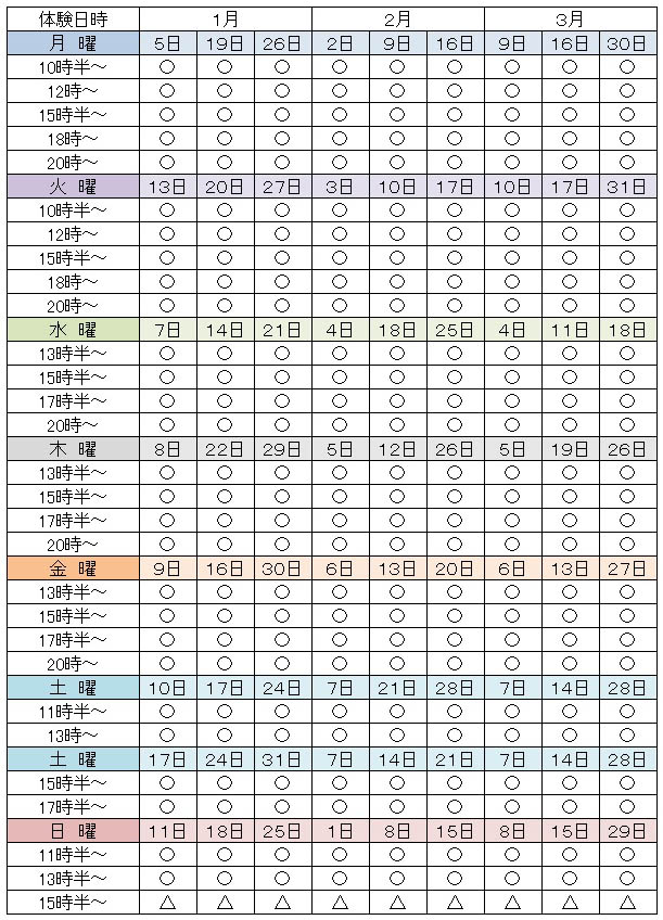 ※ ○は席に余裕あり。△は残席わずか。×は満席です。