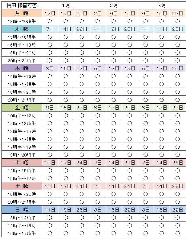 ※ ×印は休講もしくは基本クラスの座席が無いという事ではなく、振替不可という意味です